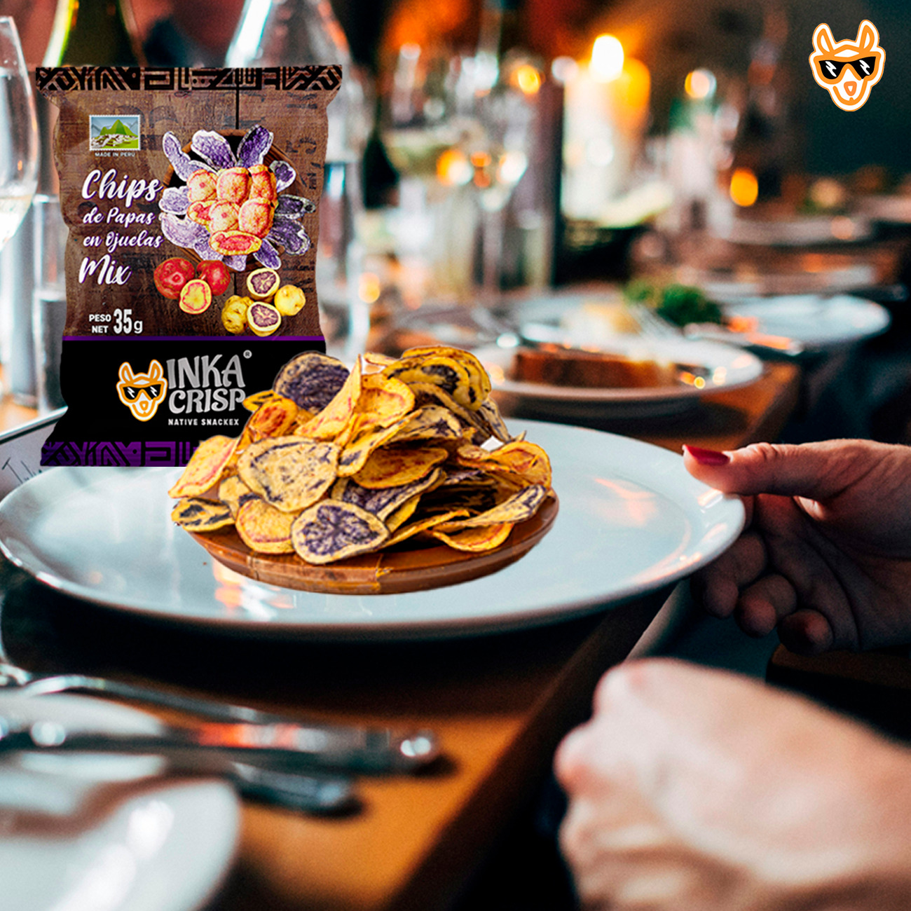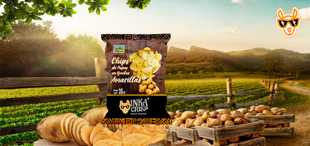 Inka Crisp, marca registrada en Indecopi con certificación sanitaria de Digesa, ofrece snacks de alta calidad elaborados con papas nativas andinas y frutas tropicales, destacándose como un producto auténtico y 100% peruano.